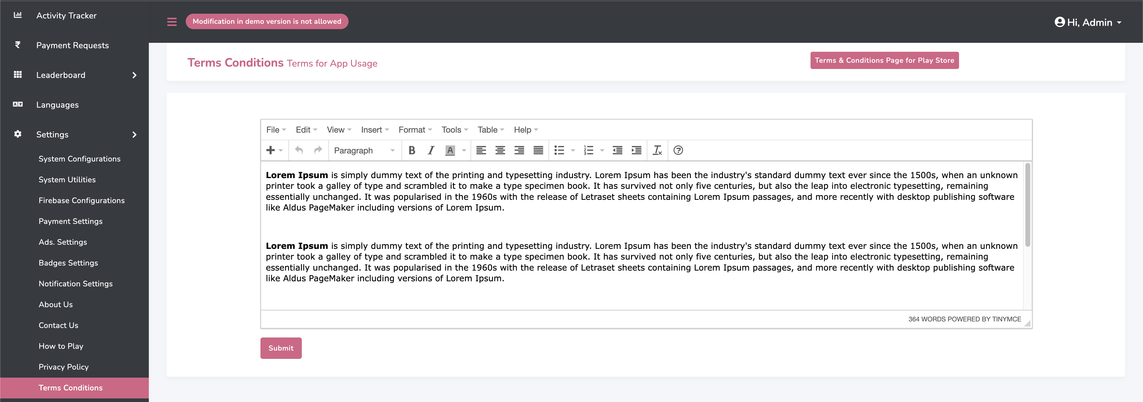 Set Terms Conditions for your website and app.